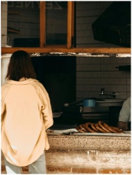 Woman buying fresh pastries from a street bakery window in an urban setting.