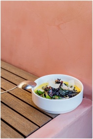 A tantalizing dish served in a ceramic bowl, placed on a wooden surface beside a pink wall.