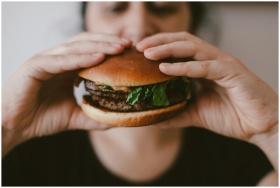 Delicious beef burger with fresh lettuce held by a woman's hands, focus on the food.