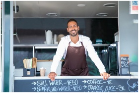 Good looking young waiter in apron standing at modern food truck counter and looking at camera with toothy smile