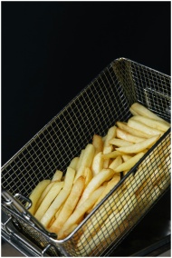 Golden french fries in a frying basket, perfect for fast food advertising.