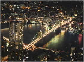 A breathtaking aerial view of Brooklyn Bridge illuminated at night, showcasing New York City's vibrant skyline.