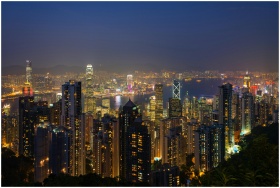 Breathtaking nighttime view of Hong Kong's vibrant skyline shining with city lights.