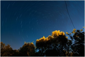 Long exposure of night sky with star trails over silhouetted trees, capturing cosmic movement.