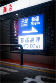 A night view of a Shinjuku highway sign pointing to the airport, taken indoors with subdued lighting.