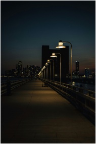 A serene nighttime view of a city with an illuminated pier leading into the darkness.