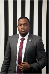Business portrait of a black man wearing formal attire against a striped background.