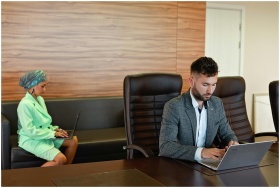Two professionals focused on work with laptops in a modern office setting.