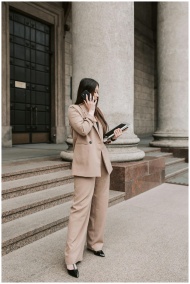 Professional woman in a beige suit stands outside