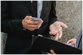 Close-up of business professionals discussing deals with a smartphone and documents, emphasizing communication and collaboration.