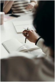 Close-up of professionals brainstorming with noteb