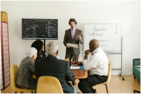 A corporate professional presents market data duri