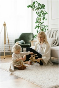 A mother and daughter enjoying quality time playing with wooden toys in a cozy living room.