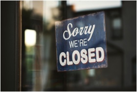 A vintage "Sorry We're Closed" sign on a glass door reflects street view outside.
