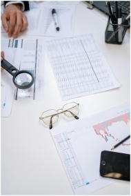 Flat lay of business documents with magnifying glass, glasses, and smartphone on a desk.