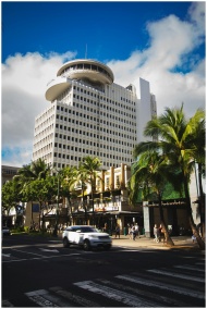 Dynamic street scene featuring the iconic Top of Waikiki restaurant in Honolulu's urban landscape.