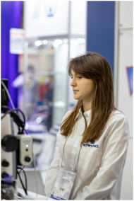 Businesswoman in uniform stands attentively at a trade show booth.