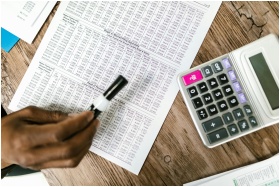 Close-up of tax documents and calculator on wooden