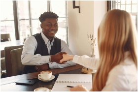 Two adults shaking hands across a table in a coffe