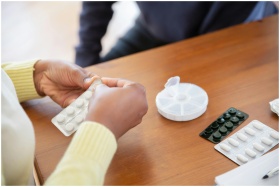 Close-up of a nurse organizing pills and medications on a table in a care setting.