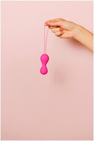 Close-up of a hand holding pink silicone ben wa ba