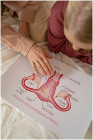 Close-up of hands pointing at a female reproductiv