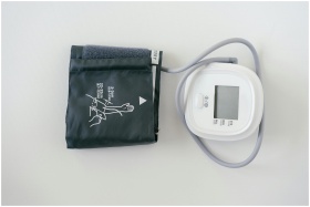 A digital sphygmomanometer on a white background, used for measuring blood pressure.