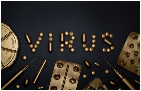 Conceptual image featuring gold pills and syringes forming the word 'virus' on a dark backdrop.