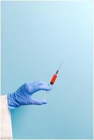 Gloved hand holding a syringe on a light blue background, representing medical procedures.