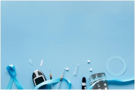 Flat lay of diabetes awareness items and medical tools on a blue background. Ideal for health campaigns.