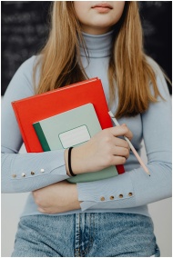 Teenage girl holding textbooks and a pen in a classroom setting, embodying education.