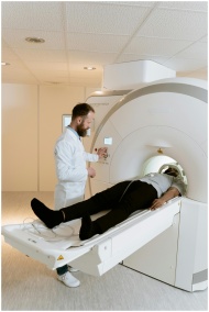 Doctor operating MRI scanner for patient examinati