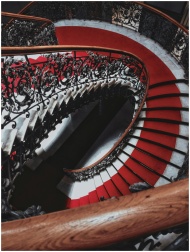A stunning spiral staircase with intricate wrought iron railings and a vibrant red carpet, viewed from above.