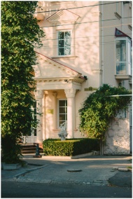 Classical facade of an elegant building in sunlight with lush greenery in Nikoleav, Ukraine.