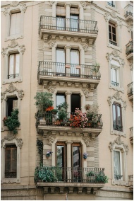 Charming European apartment building with ornate balconies and vibrant flowers.