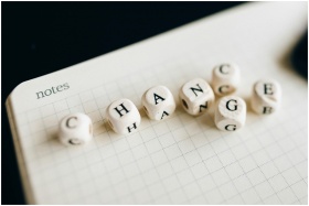 Close-up of letter dice spelling 'change' on a gri