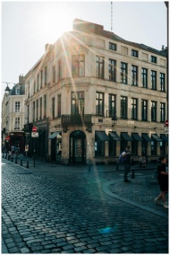 Cobblestone streets and historic buildings bask in warm sunlight, capturing urban charm.