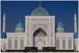Stunning view of a grand mosque with blue domes under a clear sky.