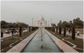 The Taj Mahal stands gloriously amidst lush gardens and a reflecting pool in Agra, India.