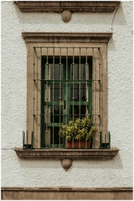 An artistic view of a green window with ornate bars and a potted plant in San Miguel de Allende, México.