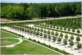 Aerial shot of Château de Chambord gardens in summer, showcasing symmetrical trees and pathways.