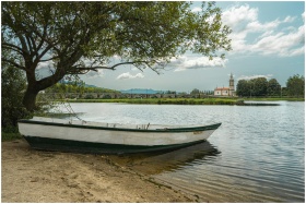 Tranquil scene of a boat on the Lima River in Ponte de Lima, Portugal, with a picturesque backdrop.