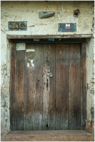 A vintage wooden door with a metal lock, showcasin