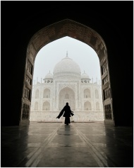 Silhouette of a woman in an arch framing the iconic Taj Mahal with foggy ambiance.
