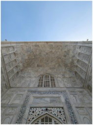 Low angle view of the Taj Mahal entrance facade showcasing intricate marble details in Agra, India.
