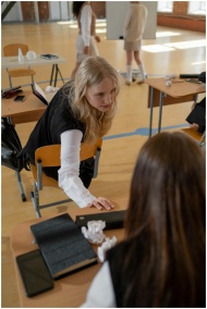 Teenage girls in a classroom, whispering and engag