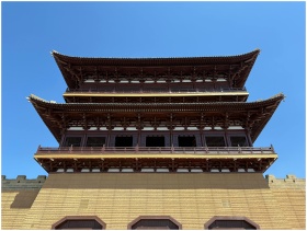 Upward view of a traditional Chinese tower with intricate wooden architecture under a clear blue sky.