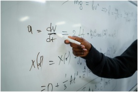 Close-up of hand writing equations on a whiteboard in a classroom setting.