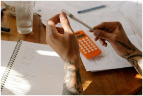 Close-up of tattooed hands holding a pen next to a calculator and notebooks.