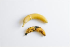 Two bananas, one wrapped in a condom, symbolizing
